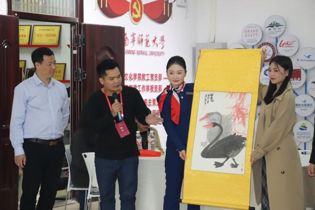 这次回母校,我带了份小礼物。我平时特别爱收藏美术书画作品,旅文不分家,每次带团我都跟贵宾们分享广西的国画山水与民族风情美术作品,游客们都特别爱听这类讲解,这也让我的讲解独树一帜,让客人感觉到不同于其他行程的讲解。这次赠送了一幅来自广西青年美术家韦贵敏(中国美协会员,南宁美协理事,北部湾书画院研究员)的没骨留痕法创作的水墨大鹅,作品不画线,用水墨浓淡来写出鹅毛的层次感。作品上有我的收藏闲章“养正”,“养正书院”来自宾阳南街,主要理念是“养正一个孩子,可以兴旺一个家族;养正千千万万个孩子,可以兴旺一个民族。”。该闲章表达了我当下的主导思想,希望这种理念能传达给更多身边的人。感谢段文军经理等现任旅文公司的领导们给了我一次表达感恩的机会。饮水思源,这份感恩的心,希望能传递给每一位谈球吧官方网站走出的学子们!
