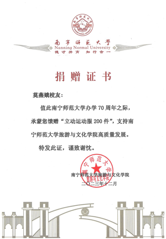 正值七秩南师之际,带着对母校的思念和祝福,四海员工如约而至,齐聚南师;共忆往昔,美好芳华!春风育桃李,桃李报春风。12月30日,2002级旅游管理专业员工莫燕娥向公司师生捐赠了200件运动服,助力公司教育事业发展。