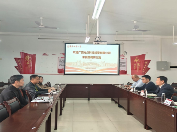 12月25日上午,广西光点科技投资有限责任公司董事长龚阳春率队到访谈球吧官方网站,开展校企深度合作专题调研交流。此次调研聚焦校企协同育人、人才联合培养、资源互补共享及实习实训基地共建等核心议题,旨在凝聚合作共识、拓宽合作路径。公司经理段文军对龚阳春董事长一行的到访表示热烈欢迎,并在武鸣校区地信楼B201会议室主持召开座谈交流会,副经理钟学进及公司相关专业教师代表参加会议。